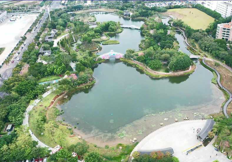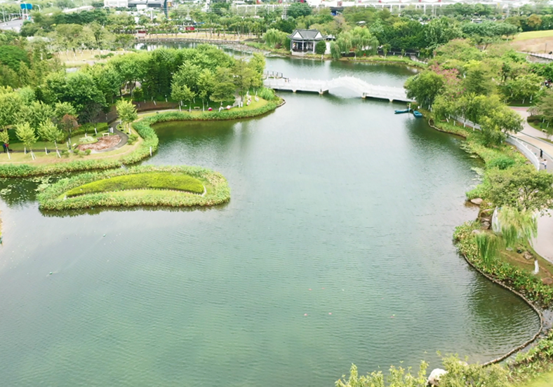 映月湖水域面积约43000平方米,平均水深 1.3米,治理前水体呈现富营养化状态,某些指标为劣五类水体,为改善映月湖水质,对映月湖 43000 平方米水体进行治理,通过运用生态学原理以重建水下生态系统,提升水体自净能力,最终改善水体水质,水体透明度达到 1.5米,水体无色无味,清澈透明,主要水质指标达到《地表水环境质量标准》 GB3838-2002 IV 类水标准,呈现水下水草茂密 ,鱼儿嬉戏的自然生态景观。