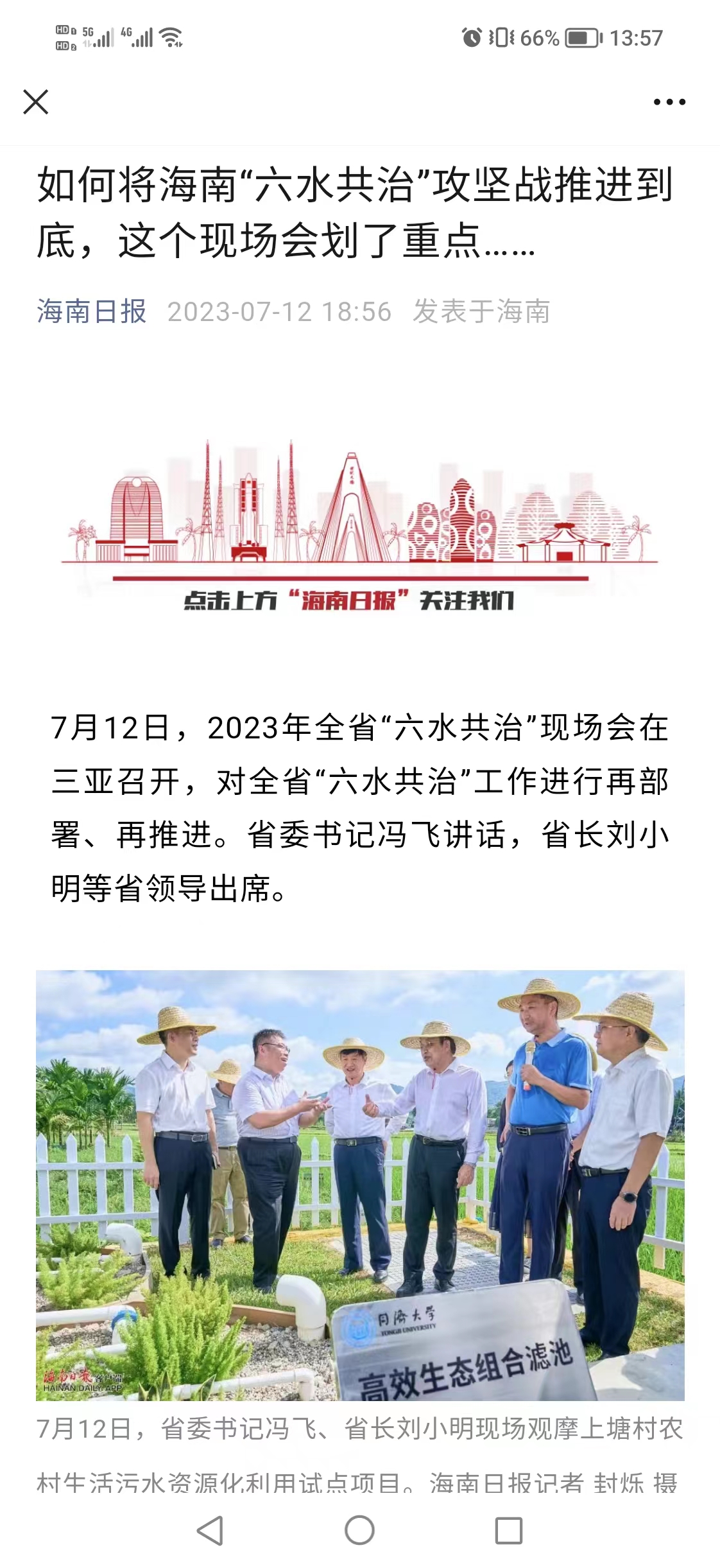2023年,海南省“六水共治”现场会在三亚召开。省委书记冯飞、省长刘小明等与会同志视察了三亚市上塘村农村生活污水资源化利用试点项目。