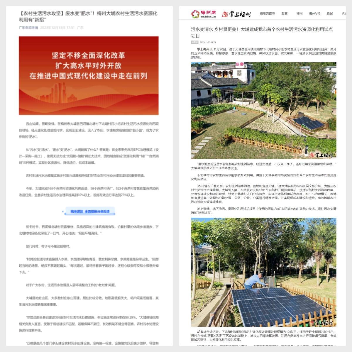 近年来,大埔县将农村生活污水治理作为推进“百千万工程”的重要环节,结合大埔空心村的地形特点和人口分布及资源化利用现状,采用了EPC治理模式, 聘请专业团队,通过因地制宜、科学分类的方法,积极推动生活污水资源化利用和有效管控,摸索出了一条“单户+联户”生活污水治理的低成本路径,打造了农污资源化利用的“大埔经验”。