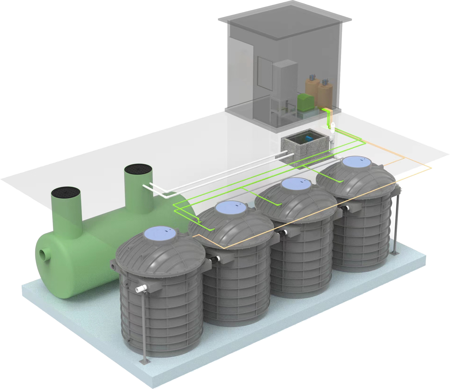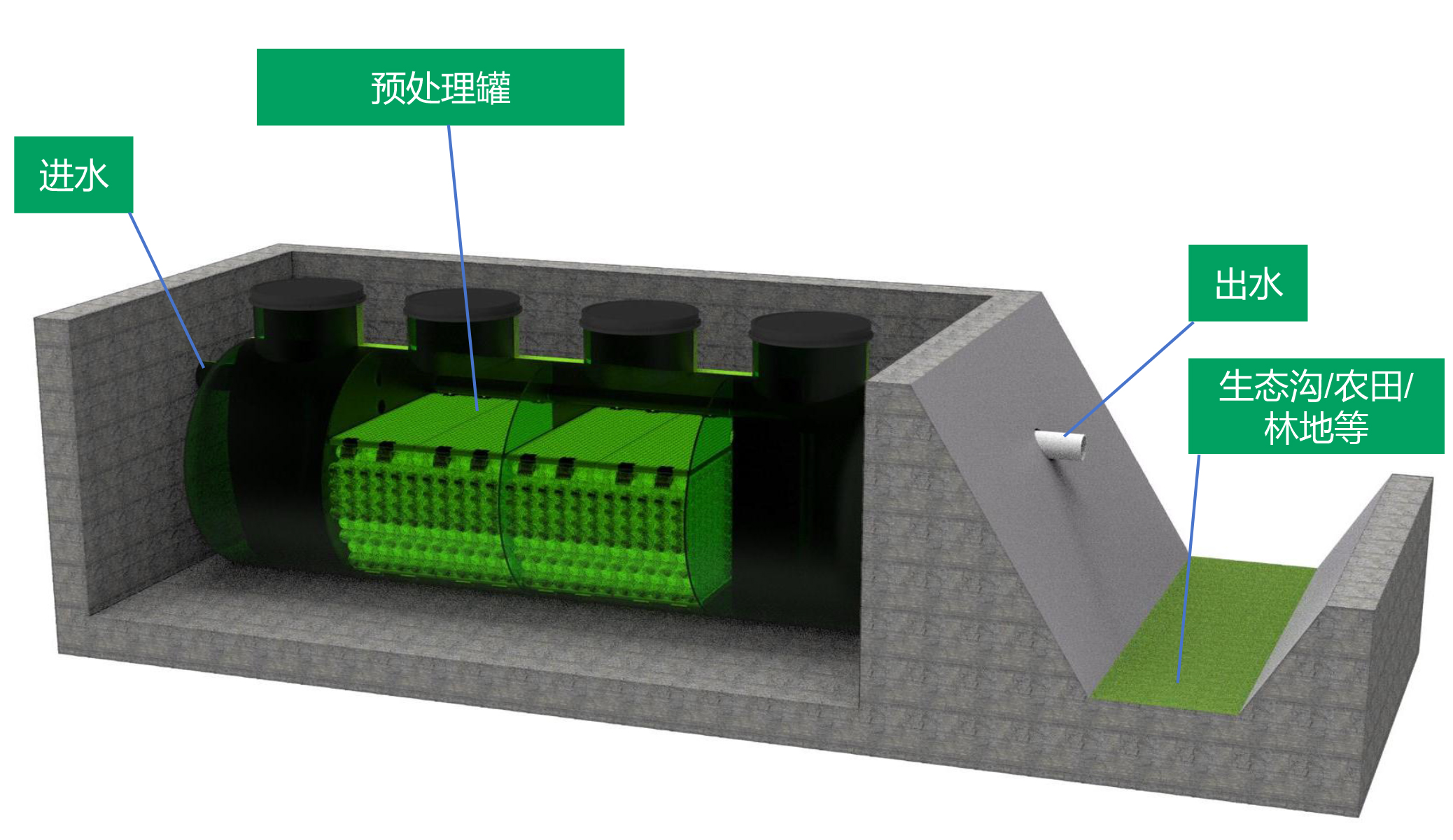 强化预处理罐(微动力): 适用于联户/连片资源化利用 包含隔渣与沉淀区、生化区、清水区三级池体,污水经预处理罐处理后进入清水区,通过提升泵将清水提升输送至资源化利用受纳体。 适用条件: 服务常住人口:6户~114人;处理规模3吨、5吨、8吨三个规模。 现场条件:受纳体地势平坦或较高,处理出水无法自流进入受纳体利用,需要提升后接入受纳体。 特点:1、占地小、埋深浅、选址灵活;2、微动力间歇好氧生物强化技术;3、出水不黑不臭,农民易于接受入园。 | ![]() |