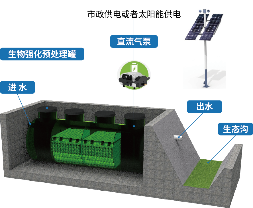 资源罐(微动力): 建设设施治理模式 污水处理站点(规模≥20t/d) 对于村庄规模相对较大且集中连片的自然村,常住人口超过260人,集中污水收集处理量≥20t/d的自然村,采用建设设施治理模式,采用“多级生物接触氧化”工艺进行处理。 特点: 1、组合形式:根据实际情况可多罐串联、多组并联。 2、多级A/O工艺稳定性高、抗冲击负荷能力强。 3、出水可资源化利用也可排放至周边水体 | ![]() |