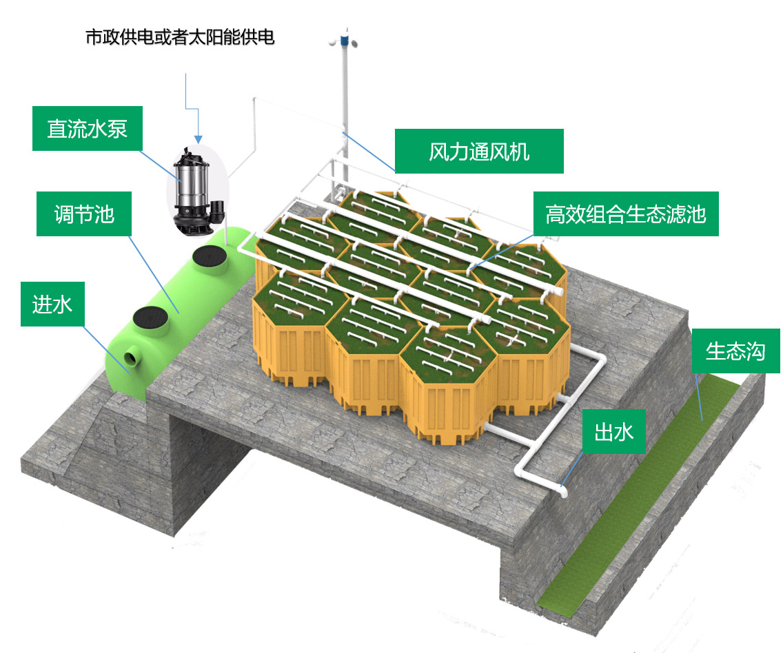生物滤池(微动力): 适用于连片资源化利用 标准化装配式处理单元组合而成,配套布水系统、生物滤料系统,结合植物供氧和强化自然复氧双重作用,实现有机物的高效去除,保留植物所需的氮磷营养元素。 适用条件: 服务常住人口:115~260人;处理规模10吨-12吨-15吨-18吨四个规模。 现场条件:人口较多,房屋相对集中,处理量≥10t/d的自然村,出水回用至农田、林地等地方资源化利用。 特点:1、占地小、选址灵活,可通过调整滤池标高实现自流出水利用;2、间歇式进水,有氧无氧环境交替,强化处理效果;3、强化自然通风,出水不黑不臭。 | ![]() |