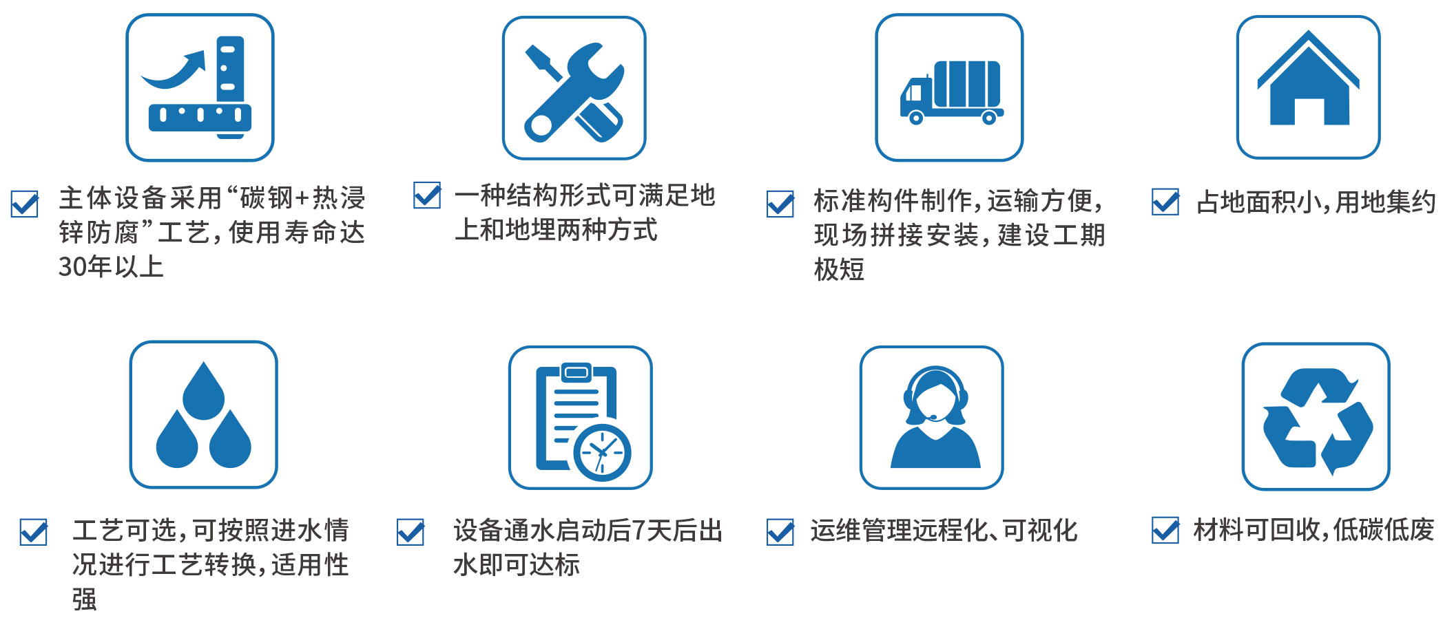 装配式污水处理厂产品,通过将各种预制成型的模块单元在项目现场快速组装而成,具有工期短、土建工程量少、施工运输方便、防腐防漏性能好、投资成本低、结构可靠等特点。满足30年使用寿命,具有极高的结构强度,可灵活组合成各种池型,满足各种污水处理工艺需求。